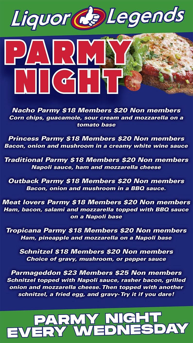 Our fantastic menu consists of all the pub favourites and a few modern treats. Kids are also accommodated for with a large range menu so there is always something to keep the fussy ones covered. We have lunch specials available Monday to Friday. Tuesday and Thursday nights are our members nights with 500 member rewards points for every main meal purchased. Wednesday is our Parmy night with 8 different toppings to choose from for $18 for members. Parmy night also features our legendary Parmageddon.